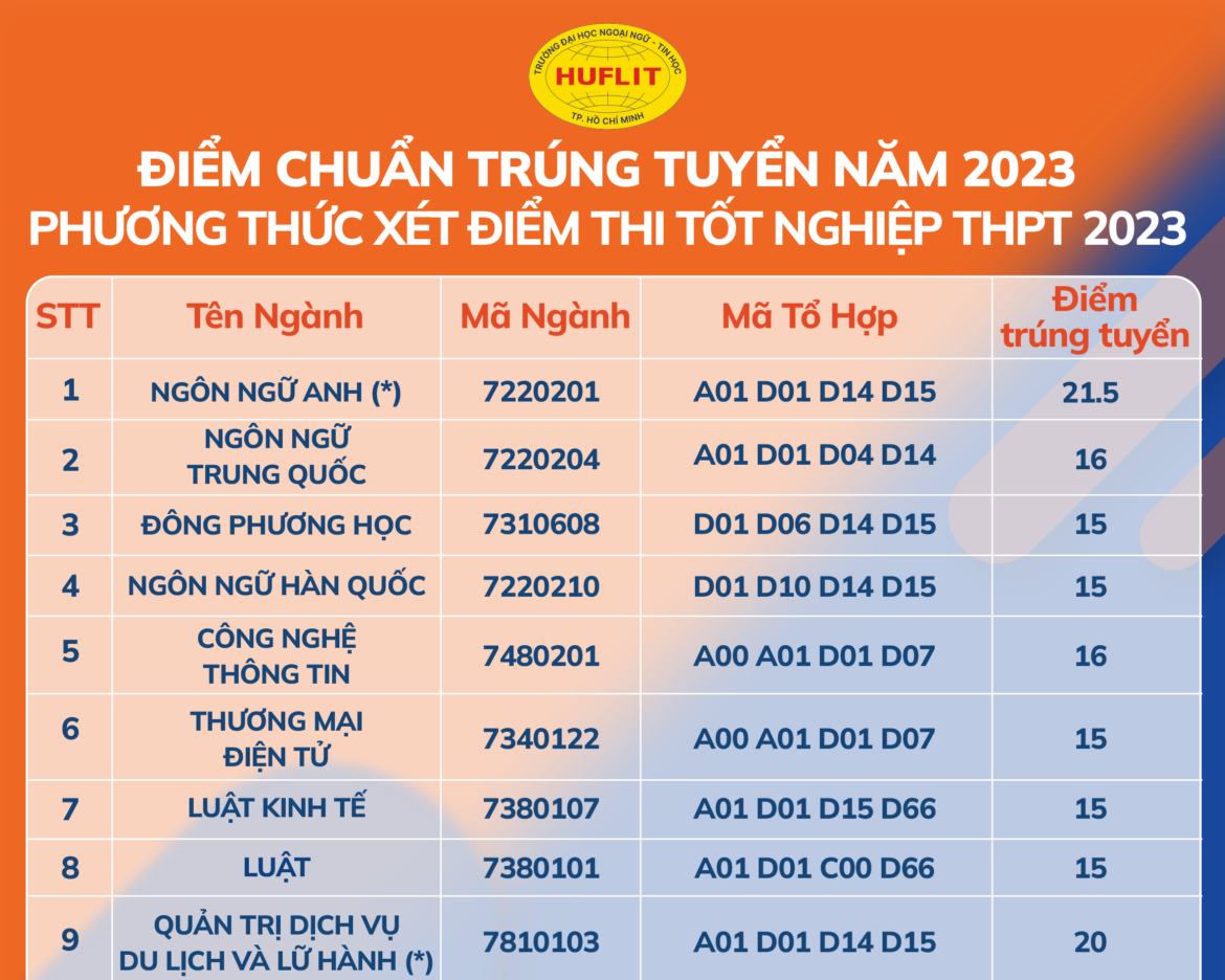 Chuẩn bị vào mùa tuyển sinh Đại học – Cao đẳng 2024, nhiều thí sinh đã bắt đầu quan tâm đến điểm chuẩn đại học, trong đó có điểm chuẩn của trường Đại học Ngoại ngữ – Tin học TP.HCM (HUFLIT). Bài viết này tổng hợp điểm chuẩn của HUFLIT trong 3 năm gần đây nhất của các hình thức xét tuyển, để thí sinh và phụ huynh có thêm cơ sở tham khảo.